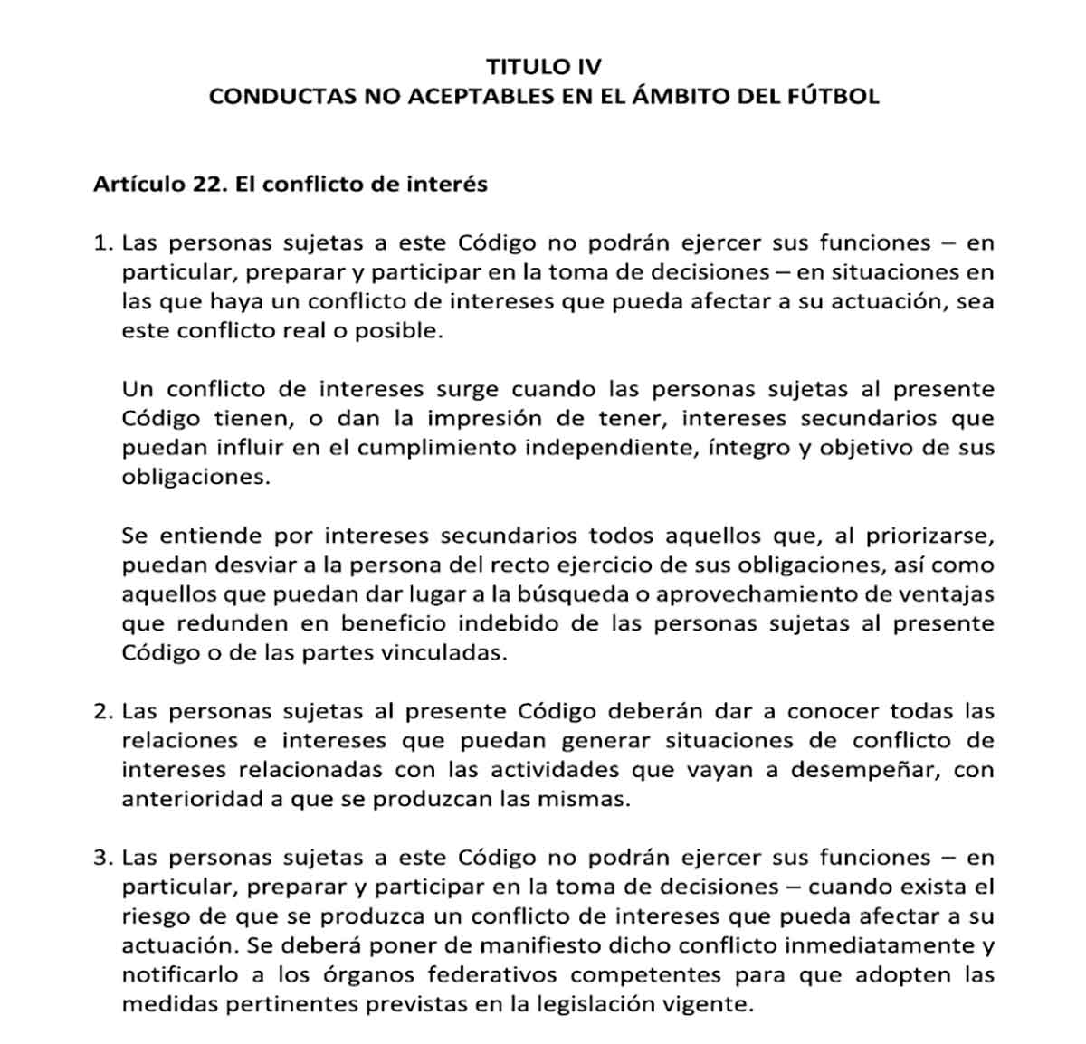 Usted, querido lector, y yo, nos hemos enterado esta semana de los detalles de este contrato, pero Compliance los debió saber en su día. Recuerden lo que digo de Rubi y el Compliance de la RFEF, acción u omisión. Lo mismo para Geri y el del Kosmos Holding, acción u omisión. El Comité de Ética, Integridad, cualquiera de ellos, debía conocer estos detalles. No les hacía falta ni siquiera conocerlos todos, Texas (conflicto de intereses) era muy visible, plausible, posible y real. Se podía ver desde la Puerta del Sol detrás del letrero de Tío Pepe. Desde las ‘cuestas blancas’ de mi pueblo. Desde Motril. Desde cualquier punto de la orografía nacional, internacional y estelar.  El artículo 22 del Código Ético de la RFEF lo deja claro: