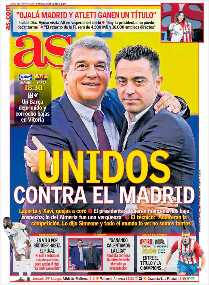 Por lo demás, tanto As como la prensa cataculé traen como argumento principal las patéticas quejas e insultos de Xavi y Laporta, tanto monta monta tanto, contra el Real Madrid. Laporta anda descompuesto desde que sabe que Negreira declarará ante el juez (el próximo día 21), y canaliza sus defecaciones verbales a través del sistema de alcantarillas que conduce a Valdebebas. Aunque es un sistema moderno y el hedor no trasciende a la altura de los despachos, porque no ofende quien quiere sino quien puede, Paco Sánchez Palomares les responderá hoy en La Galerna. A los dos.