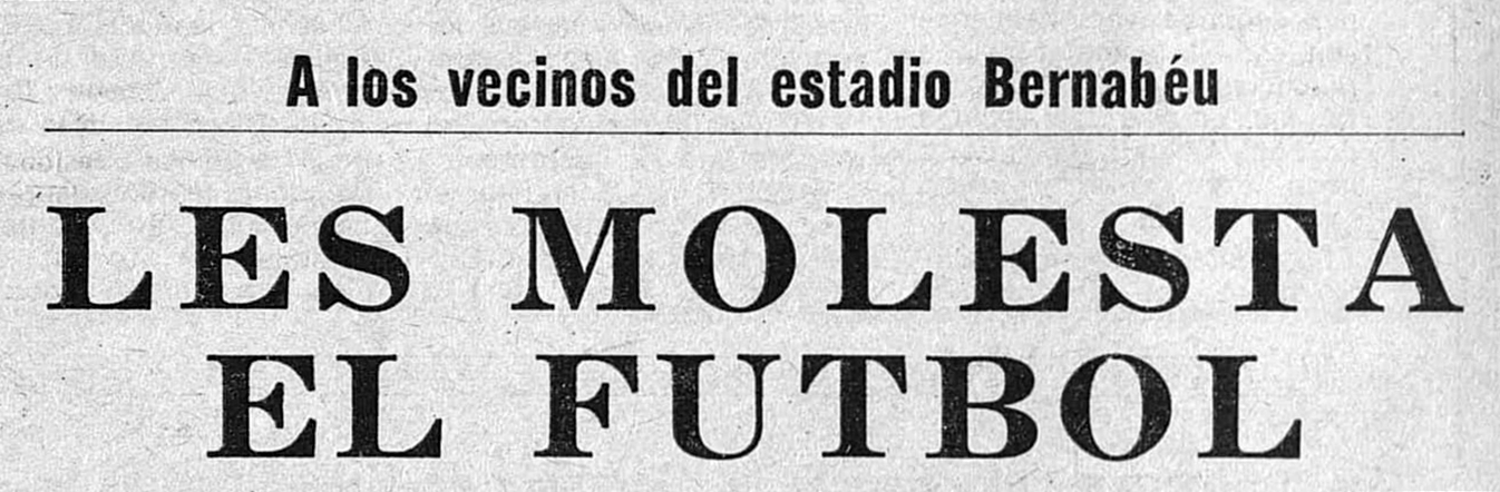 Con el titular ‘Les molesta el fútbol’, explicaba que “las posibles ventajas del espectáculo son anuladas por las incomodidades de los llenos”. Añadía que “semana tras semana, los habitantes de los edificios próximos al estadio Bernabéu se ven invadidos por una multitud de coches, repletos de aficionados. Coches que aparcan en cualquier sitio, en doble o triple fila, encima de las aceras. Toda la zona se improvisa como aparcamiento y circular por ella es imposible”. Los vecinos quedaban aislados en sus edificios, y si pretendían salir de ellos, debían hacerlo dos horas antes de que comenzasen los partidos y su coche quedase inmovilizado entre los miles de los asistentes al estadio. Incluso para entrar en sus propias casas, los vecinos tenían que aparcar a un kilómetro del estadio y llegar a pie, aguantando empujones, gritos, ruidos etc.