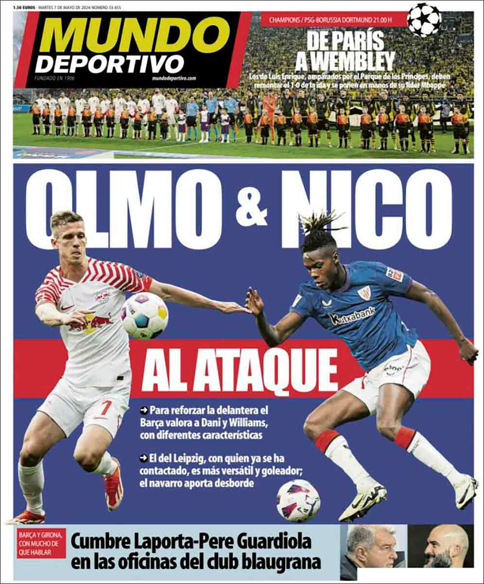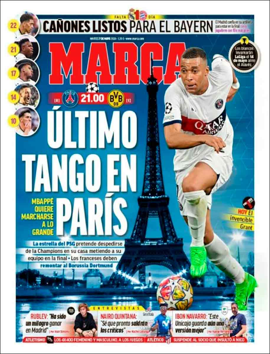 Marca va partido a partido, en clara muestra de la devoción cholista compartida con tantos otros medios, y no se fija en lo del miércoles sin antes prestar atención a lo de hoy mismo. Porque esta noche, en el Parque de los Príncipes, lucharán por el otro puesto en la final PSG y Borussia Dortmund. Llegan los alemanes con ventaja de un gol, y la responsabilidad de la remontada recae en Mbappé, a quien Marca, en atinada referencia cinematográfica, pone ante su "último tango en París". Kylian deja el PSG (a estas alturas no hará falta especificar a dónde), de ahí lo de que el tango sea el último. Prosiguiendo con la referencia, no nos cabe duda de que el crack francés ya está preparando la mantequilla para aplicar al Dortmund la misma política que Marlon Brando ejecutaba en el largometraje de Bertolucci . No sabemos si los alemanes, dignísimo rival, se dejarán.