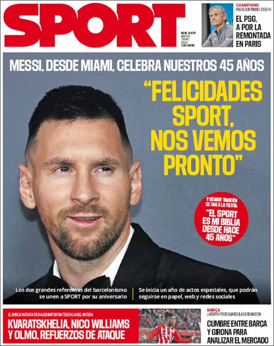 Por lo demás, nos unimos a Messi y a Joan Manuel Serrat en nuestra felicitación a Sport por sus 45 años de existencia. Nos parece, eso sí, enormemente elocuente el que Sport no sea capaz de autofelicitarse sin cagarla con la coma del vocativo. Qué gloriosa manera de sellar 45 años de... pues eso, de Sport. Dice Serrat que dicho rotativo lleva eso, 45 años siendo "su Biblia". No debemos nunca juzgar a los grandes genios por sus vicios, por oscuros y sórdidos que se nos antojen, y Serrat es indudablemente un genio. Estamos esperando que alguien le pregunte un día por Negreira, a ver qué opina, pero mucho nos tememos que esa entrevista no verá nunca la luz.