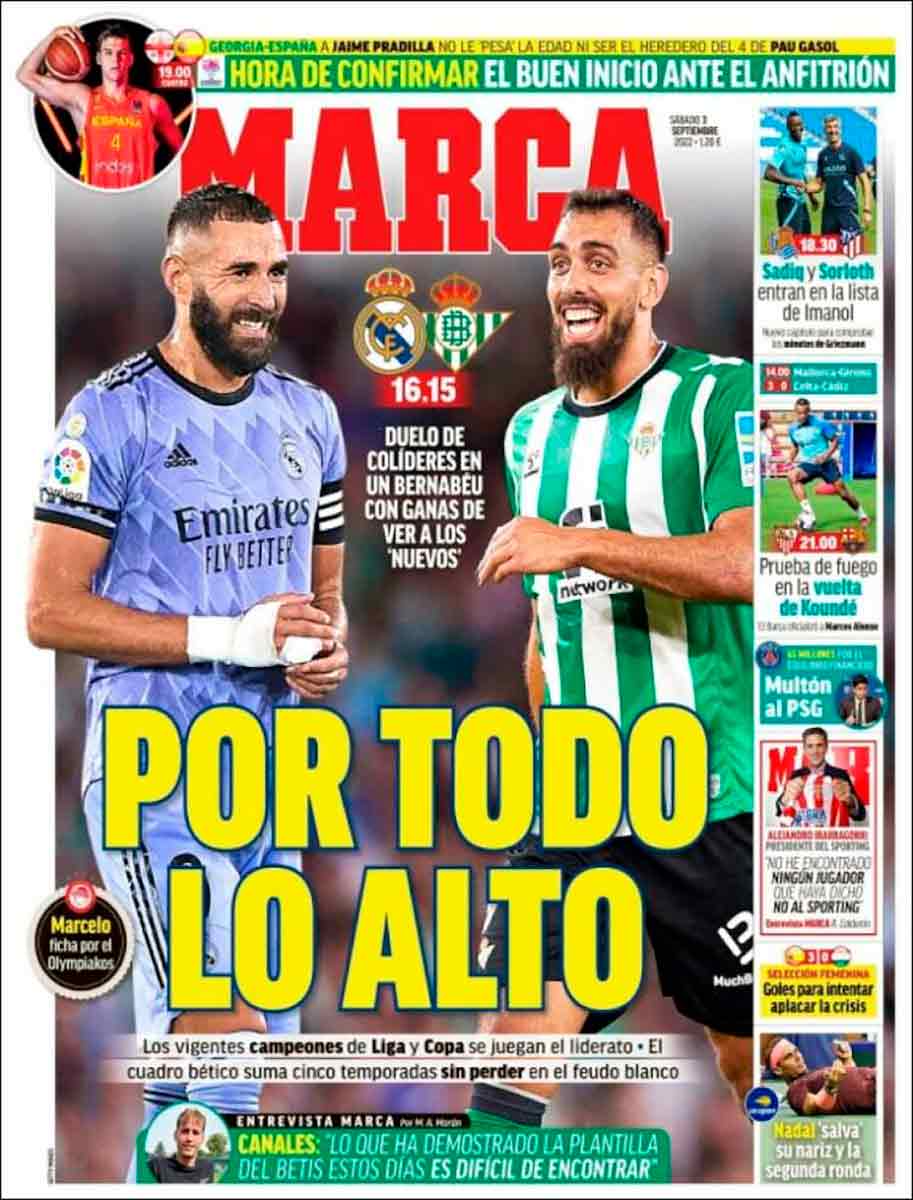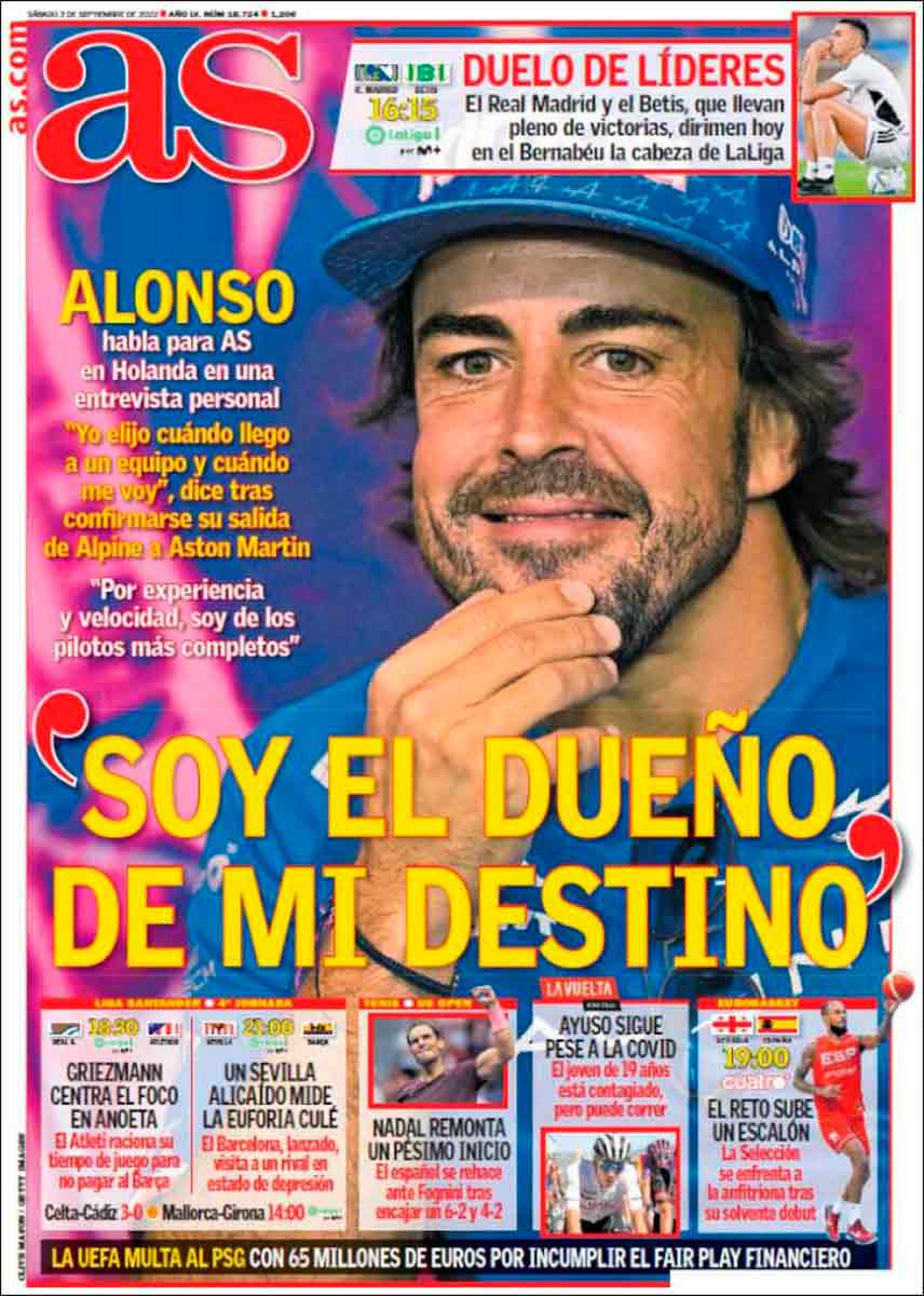 Volviendo a la primera plana de As, poco más que añadir. Acostumbrados como estamos a que Erling Braut Mbappé y Bernardo Lewandowski Junior sean protagonistas en portada por algo que dijeron en la presentación de una bebida isotónica a base de ciruelas criogenizadas en agua mineral a baja temperatura, entendemos perfectamente que apuesten por Fernando a todo color —y mandíbula— despreciando así nuestro sabatino concepto de este nuestro portanálisis. Eso sí, tanto Marca como As, aún en pequeñito, vale, apuntan la sanción de muchos milloncejos que le ha caído al Peseyé catarí de manos de la cueva de Alí Babá de la UEFA por vulnerar el fair play financiero.