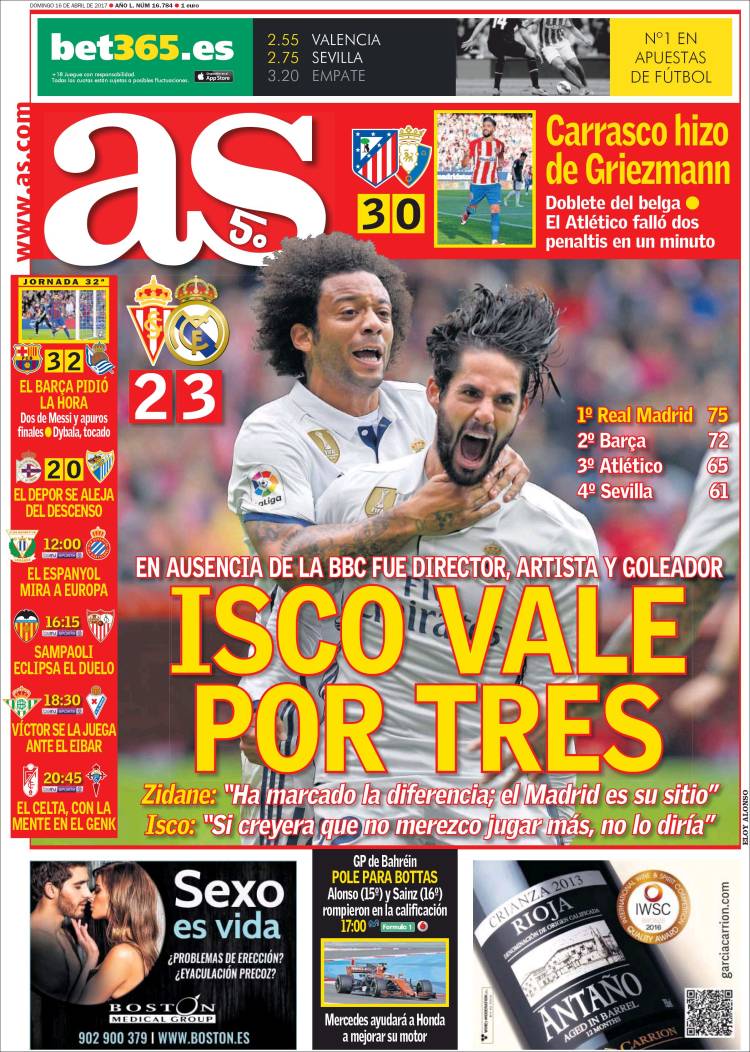 En la portada de As Isco no saca la lengua, precisamente porque Isco le saca la lengua a la portada de As. Los de Relaño son don erre que erre con su cantinela, con su letanía, y lo de Isco ayer en El Molinón no es entonces una exhibición formidable, sino una excusa para volver a atizarle a la BBC y a Zidane. No pierde ocasión el As de no dar rabia, sino pena. No pierde ocasión de que ensalzar a Isco sea solo algo secundario, una herramienta, una vía (muerta) que conduce al -ya quisieran- desprestigio de la delantera madridista y de su entrenador.