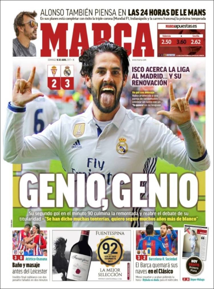 Tan gráfico, tan esclarecedor, nos parece el gesto de Isco que recoge Marca en su portada, que comenzamos así, directamente con él, sin mediaciones, acaso porque aquí sí puede ser válido eso de que una imagen vale más que mil palabras, aunque una imagen no es nada -o es cosa insuficiente y solo insinuación, pretexto o sugerencia- sin una interpretación de la misma, asunto que solo es posible hacer precisamente con palabras, esas que valen menos que una imagen solo al final, es decir, cuando las palabras ya han hecho su labor interpretadora y pueden retirarse para que simplemente miremos la imagen, ahora sí plena de significado.