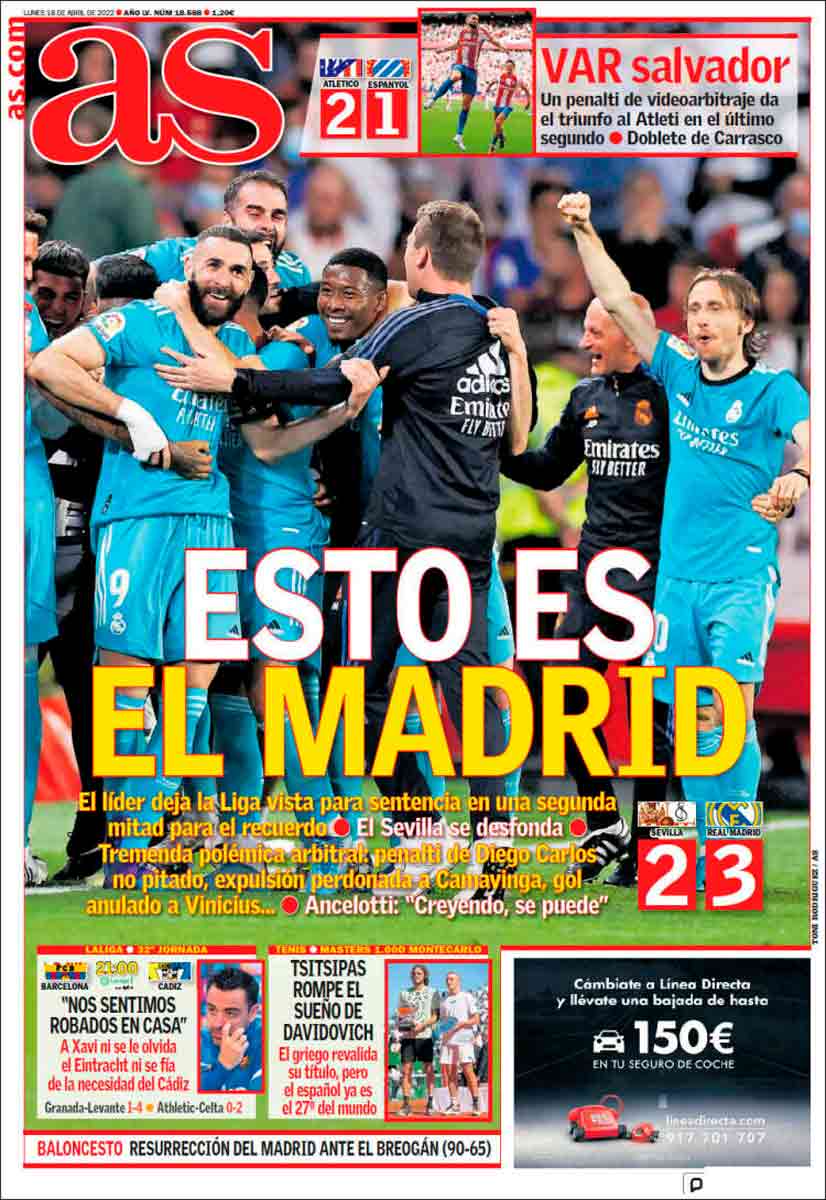 Buenos días. El Real Madrid se adjudicó anoche todas las papeletas para proclamarse campeón de Liga. Venció en Nervión remontando un 2-0 al Sevilla, en un segundo tiempo pleno de energía, determinación y fútbol de muchísimos quilates. Fue una segunda mitad para el recuerdo que desmiente que el equipo entrenado por Carlo Ancelotti sea solo pundonor, suerte e individualidades, como proclama el espectro anti para deslegitimar todo lo que hacen los blancos.  Borraron del mapa a los de Lopetegui para terminar ganando 2-3, sobreponiéndose a un sinnúmero de obstáculos, entre ellos el más grave de todos, el institucional. Lo que hizo anoche el Real Madrid, aparte de honrar el fútbol con un recital memorable, consiste en dejarlo todo a punto para ganar un campeonato organizado por sus enemigos, ni más ni menos. El Real Madrid queda ya muy cerca de hacerse con el segundo título en tres años, y debió haber sido una serie completa de tres de no haber sufrido el año pasado precisamente lo que ahora sigue ahí pero no es suficiente para frenar un espíritu y un fútbol indomables, es decir, lo que universalmente se conoce ya como el Tinglao.