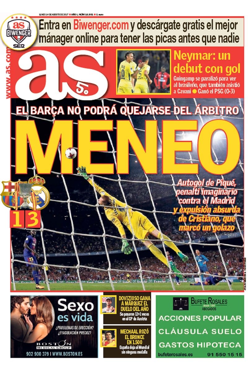 Nos vais a perdonar por no hablar, en este 'Portanálisis', del atraco -uno más- que sufrió el Real Madrid en el Camp Nou. Tampoco vamos a hablar del baño que el equipo de Zidane le dio al Barcelona, al que incluso marcó estando en inferioridad numérica -sensación que se repite año tras año-. Y no, no vamos a rellenar estas líneas comentando la injusta expulsión sufrida por Cristiano Ronaldo. Hoy no. Hoy las portadas aparecerán aquí, pero será algo testimonial. Estamos cansados. Estamos hartos. El día en el que la prensa madrileña destaca la exhibición merengue y la catalana llora por la mediocridad de su equipo y pide que se castigue a Cristiano porque le tienen más respeto y miedo que asco, nosotros pedimos, porque alguien tiene que hacerlo, que sancionen de una vez a Luis Suárez.