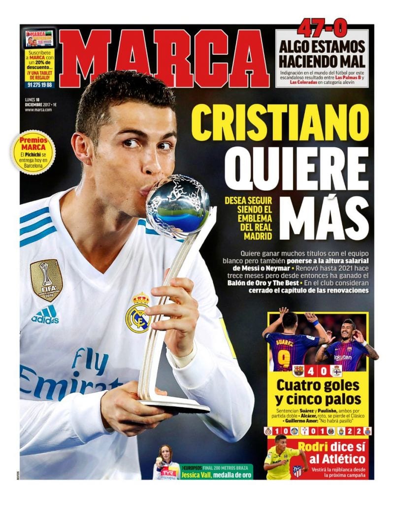 El Marca dice (en letras blancas) que Cristiano "quiere más". Y continúa (en letras blancas) "ponerse a la altura salarial de Messi o Neymar". Únanse sin solución de continuidad todas las letras blancas y ya sabemos lo único que, según Marca, quiere Cristiano.