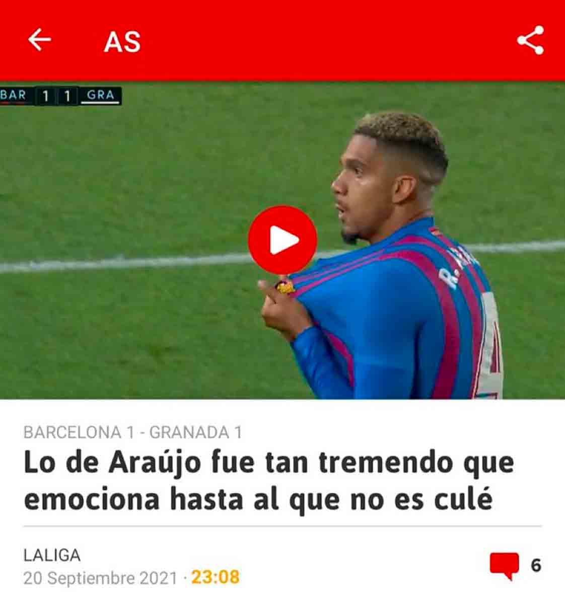 La prensa culé, de manera totalmente lícita, destaca el empate a última hora de Araújo (por cierto, pinta muy bien este central). Tanto Mundo Deportivo como Sport tienen que resaltar lo único positivo del desastre de anoche en el Nou Camp.