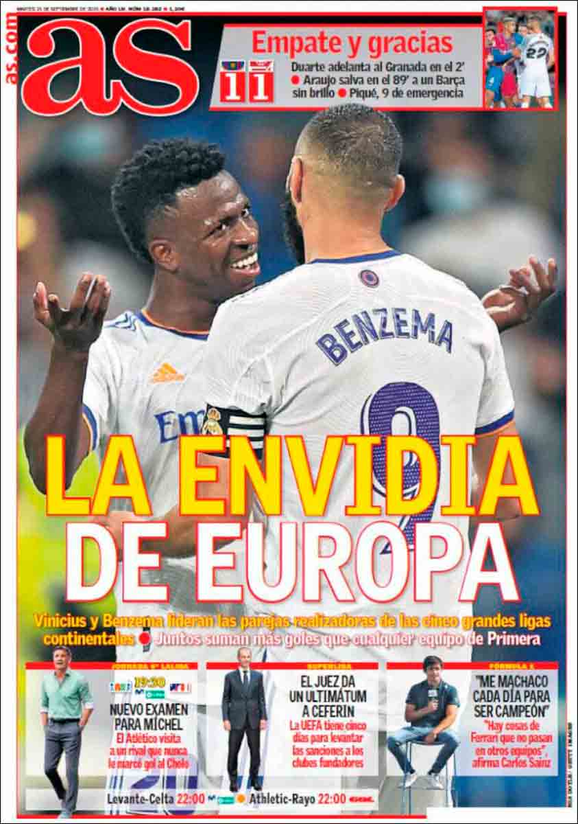 El diario As sí habla del Madrid y lleva a su portada la pareja del momento: Vinícius y Benzema. Dice de ellos que son la envidia de Europa, los máximos goleadores de las ligas continentales y que juntos suman más goles que cualquier equipo de Primera.