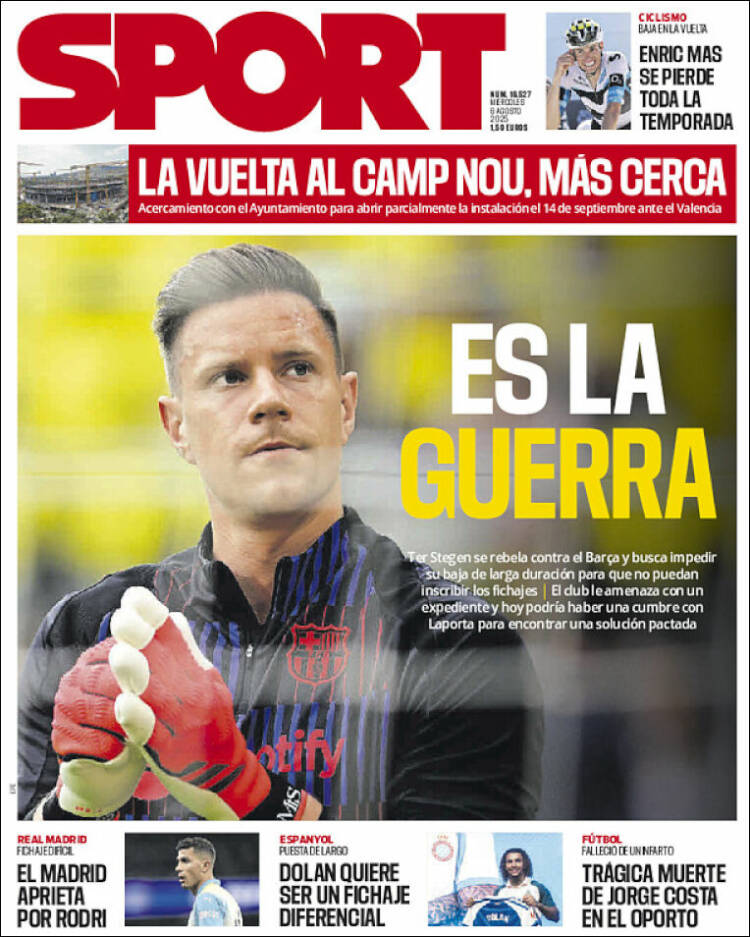 Sport llama “guerra” entre guardameta y club a la tensión entre ambos, y no parece que exagere. Sugiere el eximio rotativo catalán que podría haber una reunión entre ambas partes para “encontrar una solución pactada”. Apostamos por el ofrecimiento de unas ganancias diferidas, muy diferidas si nos apuráis, pero sustanciosas, a cambio de la firma del informe médico. No firmes, Marc-André. Sé fuerte. A fin de brindarte ánimo para aguantar el pulso, crearemos el hashtag #SeFuerteMarcAndre y le daremos todo el vuelo en nuestras redes sociales. Alguien tiene que frenar los planes, impíos pero impunes, ilegales pero aparentemente imparables, de esta caterva de sinvergüenzas. Si no les para Ter Stegen, experto en atajar, ya no sabemos quién podrá hacerlo, y lo que es peor: quién querrá.