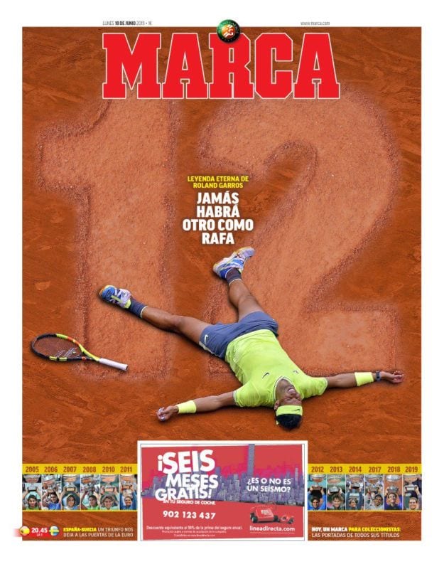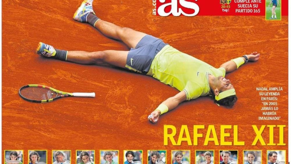Enhorabuena a Rafa por su duodécimo Roland Garros. Es un registro imbatible que le confirma, por si hiciera falta, como el mejor de todos los tiempos. Como maravillosamente indica la portada de Marca, son doce ya, lo que sitúa al manacorí a un solo título de igualar al Madrid (Roland Garros es la Champions del tenis). El Real Madrid debe tomar nota y aplicarse. No puede consentir que un solo hombre iguale una marca que se ha labrado con el paso de las décadas. A Nadal, por su parte, habría que pedirle que se modere. Claro que la razón para moderarse sería el madridismo, y sin embargo es el propio madridismo de Rafa el que por definición destierra cualquier posibilidad de moderación en el ansia de victoria. El madridismo de Rafa Nadal (entendido literalmente, aunque sobre todo como ideal) le preserva de todo conformismo. Sea Nadal el Real Madrid.