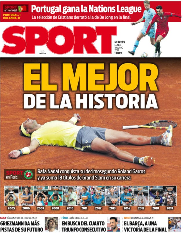 A Marça le ha venido de lujo la victoria de Nadal para ni mencionar en portada la victoria de Portugal en la Nations League. También a la Galerna, página madridista a la que honraría haber dedicado unas líneas al segundo título de selecciones que consigue uno de los dos mejores jugadores de la historia del Real Madrid. Hasta el Sport lo ha hecho.