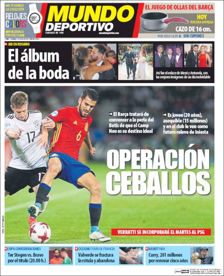 Todo lo bueno se acaba, si bien lo hace por todo lo alto con el álbum de la boda que, al unísono, nos ofrecen Mundo Deportivo y Sport en una muestra más de la labor de servicio público que tan responsablemente han sabido asumir ambos medios (dicen que) informativos. "Las mejores imágenes de un día inolvidable", dice una de las portadas y nosotros no podemos evitar morir, ay, de amor rosa; "suplemento especial 8 páginas" con "el álbum fotográfico de la boda del año", dice la otra portada y qué carajo nos importa ya aquello del fútbol cuando podemos deleitarnos con este oropel, degustar este bollito de crema y oler estos pétalos que no cesan; "Messi viajó a Barcelona tras el enlace para rematar su contrato hasta 2021", dice As y no se nos ocurre luna de miel más romántica, apasionamiento más lúbrico, entrega más absoluta a Antonela, quien iba tan blanca y radiante, tan radiante y blanca, que tal vez obligó a D10S a renovar como azulgrana tras cierto empacho de merengue.