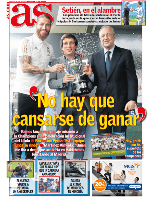 La portada de As olvida las asperezas de muchos meses y muestra sonrisas, las de Sergio Ramos y Florentino Pérez en el acto protocolario con el ayuntamiento de Madrid en el que un atlético confeso, el alcalde José Luis Martínez Almeida, recibió a la plantilla y se mostró generoso en el reconocimiento y ocurrente en la felicitación: “Borraba diez segundos de tu carrera”, le dijo al capitán. Demostró un saber estar y saber perder del que muchos otros deberían aprender. “Quién me iba a decir que acabaría en Valdebebas felicitando al Madrid”. Pues sí, quién se lo iba a decir también a los redactores de la Ouija Today, que hace casi un año se frotaban las manos con esta otra portada: