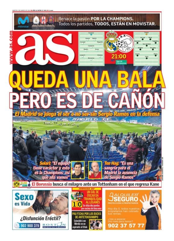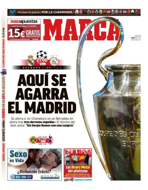 En Madrid, mientras tanto, portadas acertadas, ya que cuentan la realidad sin recurrir a fantasías extravagantes o incendios innecesarios. Reconocemos que nos jugamos la temporada a una carta y que nos pone, la verdad. ¿Que nos gustaría seguir luchando por Liga y Copa? Por supuesto. ¿Que es un palo muy grande haber perdido ya dos títulos? Evidentemente. Pero, oigan, esto es el Real Madrid y no se han ganado trece Copas de Europa lamentándose por el pasado. Vayamos a por el más difícil todavía.