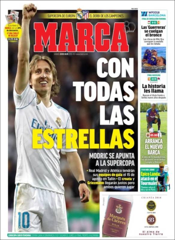 También dice la portada de Marca que Griezmann llegará, asimismo, a tiempo para la cita de Tallin el 15 del mes que viene. Griezmann jugará también la Supercopa.