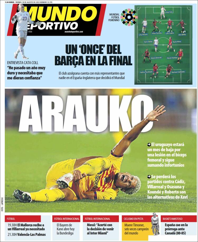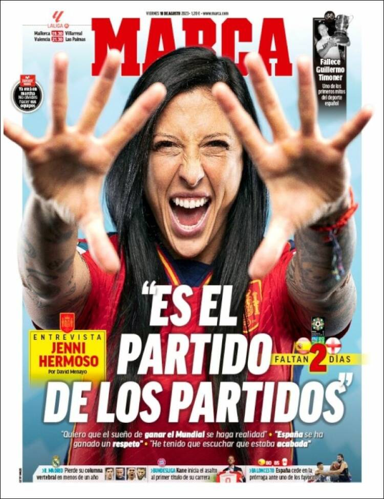 Ni en Marca ni en Mundo Deportivo aparece D. Vicente en bañador (menos mal, pues hasta lo bueno cansa en exceso), pero sí se apoya también en ambas primeras planas a la selección femenina de cara a la final del domingo, si bien de formas radicalmente opuestas. Marca entrevista a Jenni Hermoso y Mundo Deportivo se empeña en reivindicar el culerío de dicha selección. Hay un amplio sector de la prensa y los aficionados cataculés que llevan regular el hecho de que una serie de jugadoras amotinadas, muy de su cuerda, se hayan revelado innecesarias para llegar a este éxito, lo que les mueve a esta suerte de excusatio non petita tan sectaria como ridícula.