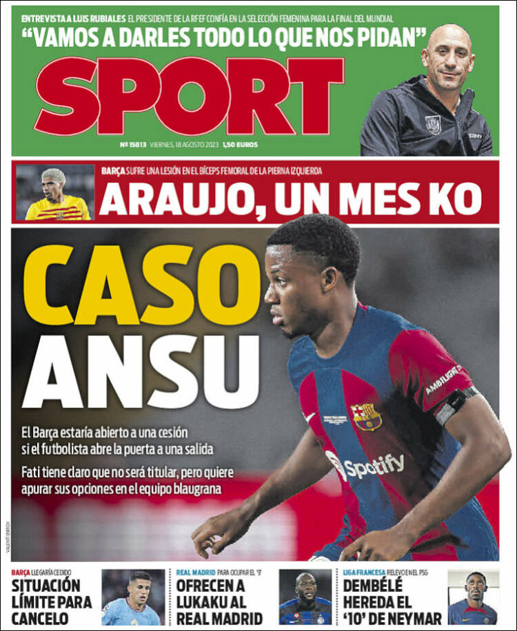 Por lo demás, la actualidad culé pasa por la lesión de Araujo, a quien por supuesto deseamos una pronta recuperación, y la situación con Ansu Fati, que reina en la portada de Sport y a quien nosotros ficharíamos no por nada, sino por fastidiar a los negreiros, que siguen mereciendo todo el vitriolo que se les pueda arrojar encima después de haberse comprado el campeonato durante un mínimo de veinte años y haberse ido de rositas después del monumental fraude.