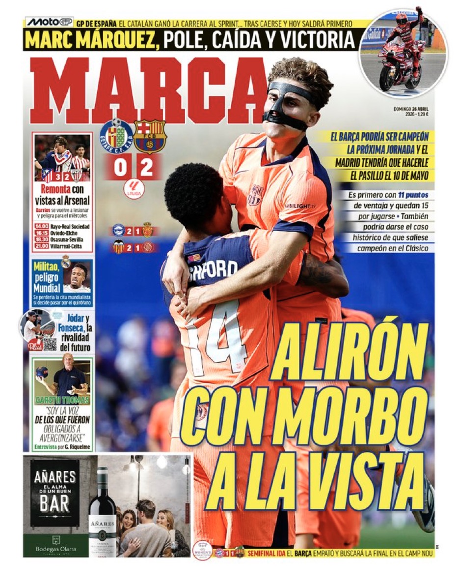Marca se hace eco de la victoria de su equipo predilecto en Getafe, y atención a cómo explica el presunto “morbo”: “El Barça podría salir campeón la próxima jornada y el Madrid tendría que hacerle pasillo el 10 de mayo”.