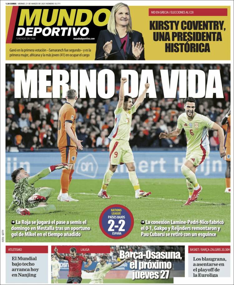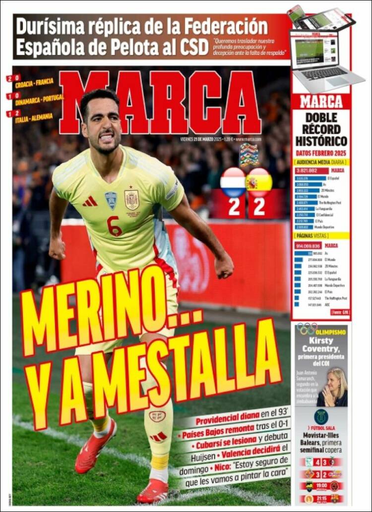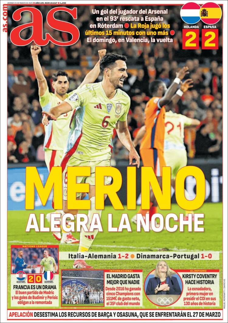Marca tiene también casi por único argumento de primera plana el empate entre LSACCE y LSACCH, logrado en el descuento por Merino, centrocampista reconvertido en llegador. Con dicho empate, entendemos que LSACCE debe ganar en Mestalla a LSACCH a fin de avanzar en la Nations League (¿se llama así?) y poder pasar a ¿cuartos? ¿Es a cuartos a lo que pasaría? Creemos que sí, pero vamos, si queréis os lo miramos. Que no quede de nuestra parte un ápice de esfuerzo por satisfacer la curiosidad y el espíritu científico de nuestros lectores.
