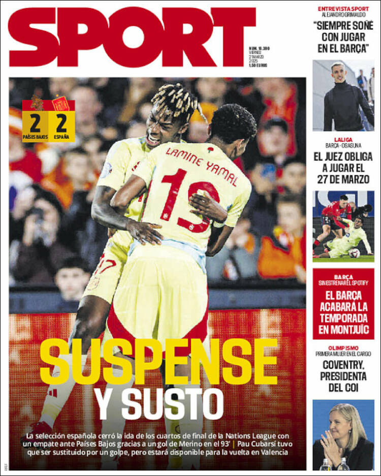 Sport habla de “suspense y susto”. Por un momento, pensábamos que estaban intranquilos ante la aparición de los audios de unas viejas conversaciones entre Joan Gaspart y Ángel María Villar, o entre Jan Laporta y Albert Benaiges. No es el caso. Solo les preocupa la lesión de Cubarsí en ese mismo encuentro entre LSACCH y LSACCE. Deseamos que no sea grave y que pronto pueda volver a los terrenos de juego, a ser posible para percibir su nómina como si la empresa que le paga fuese solvente, amén de corrupta.