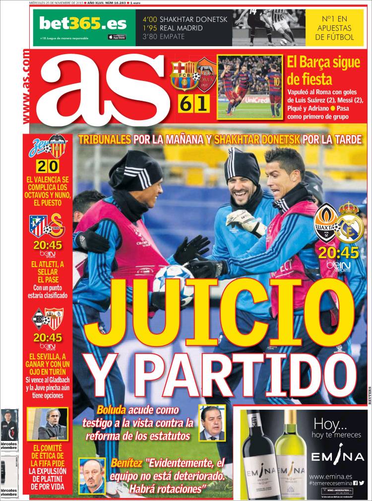 Si la separación de poderes resulta un principio básico de toda democracia sana, el sistema que domina el entorno madridista necesita de cierta reformas. No puede ser que determinados agentes, por ejemplo el diario As, actúen a la vez como avezados fiscales y como jueces, pero así ocurre. Hoy se celebra un juicio que son en realidad dos: el más literal sobre la reforma de los estatutos del Madrid y el más bien metafórico, pero tal vez más encarnizado, sobre el terreno de juego del Shakhtar Donetsk en la Champions. Sin embargo, para el Diario de la Ouija estas dos vistas son en realidad una y la misma, porque son en realidad la de siempre, la ocasión diaria de enseñarnos un Madrid en constante convulsión, al borde del precipicio, cayendo irremisiblemente desde la inalcanzable vara de medir que coloca cierta prensa.