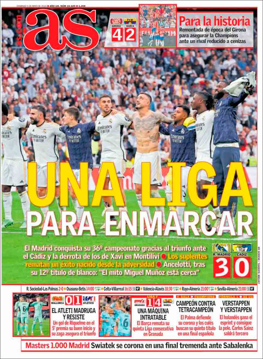 Ese mundo tiene también hoy sus portadas. Ese mundo, que es el nuestro, tan pobre que solo gana, puede solazarse con Marca y As como pocos días. El Real Madrid ha ganado la Liga y está en capilla para procurar eliminar al Bayern y optar a su decimoquinta Copa de Europa. Quién nos lo habría dicho al comienzo de temporada. Solo la historia. Nada más que la historia. Esa a la que tantas veces desoímos cuando es la única que dicta tendencias y sentencias. Esa a la que Xavi pretende sustituir como el protagonista de una tragedia que no sabe, que no ve, que solo dice y dice y que jamás escucha. Es lo que tiene ser superior.