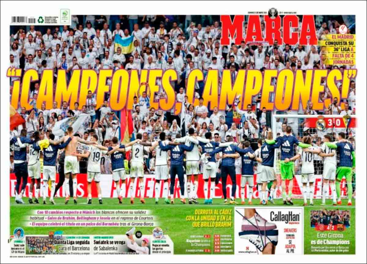 Buenísimos días, amigos. A esta hora ya sabrán que el Real Madrid se ha proclamado campeón de su Liga número 36, tras haber vencido con solvencia al Cádiz y haber perdido en enésimo descalabro el Barcelona ante el Girona, a la sazón insospechado equipo de Champions para la temporada que viene. Sea como fuere, una cosa es lo que dicen los números, ya sea el 36 de la Liga, el 3-0 del Bernabéu o el 4-2 de Montilivi, y otra cosa muy distinta es lo que dice la verdad verdadera, esa a la que se llega por clarividencia poco común, por ancestral visión o por intuición trascendental. En ese terreno poco valen los números, a los que se aferran quienes como nosotros se limitan, pobres de espíritu, a celebrar una Liga conquistada contra vientos y mareas cuando el comienzo sin Militão, sin Courtois y sin Alaba hacía presagiar un campeonato de crujir de dientes.