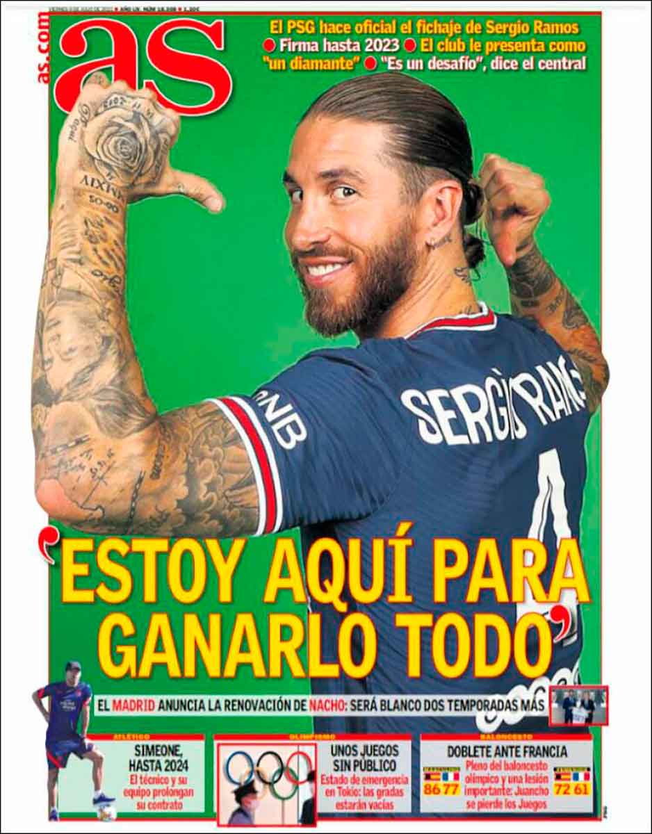 En crudo contraste con lo de Ramos, está lo de Nacho, a quien As dedica un mínimo espacio. Nacho ha dado el paso adelante allí donde el sevillano vaciló, enfermo de cálculo, pero este hecho no merece ni la mitad de la mitad de la mitad de espacio en el criterio del portadista de As. ¿Por qué? Porque la imagen de Sergio con la camiseta del PSG hace daño y la otra da gusto verla. Por eso. También porque Sergio Ramos es un jugador más reconocido que el de Alcalá, claro, y su destino es objetivamente más noticia que la continuidad de Nacho, no lo negamos. Pero no es difícil incluir también en la ecuación un afán prematuramente sádico con el aficionado del Madrid, a quien se le subrayan las pérdidas mientras se pasan casi por alto las buenas nuevas. Nacho es un defensa enormemente sólido, el mejor defensa español de la temporada pasada lo sepa o no Luis Enrique, y el que una su destino dos años más con el del Madrid es un acontecimiento digno de celebración. Ha dado un paso al frente y se le puede considerar titular por derecho propio.