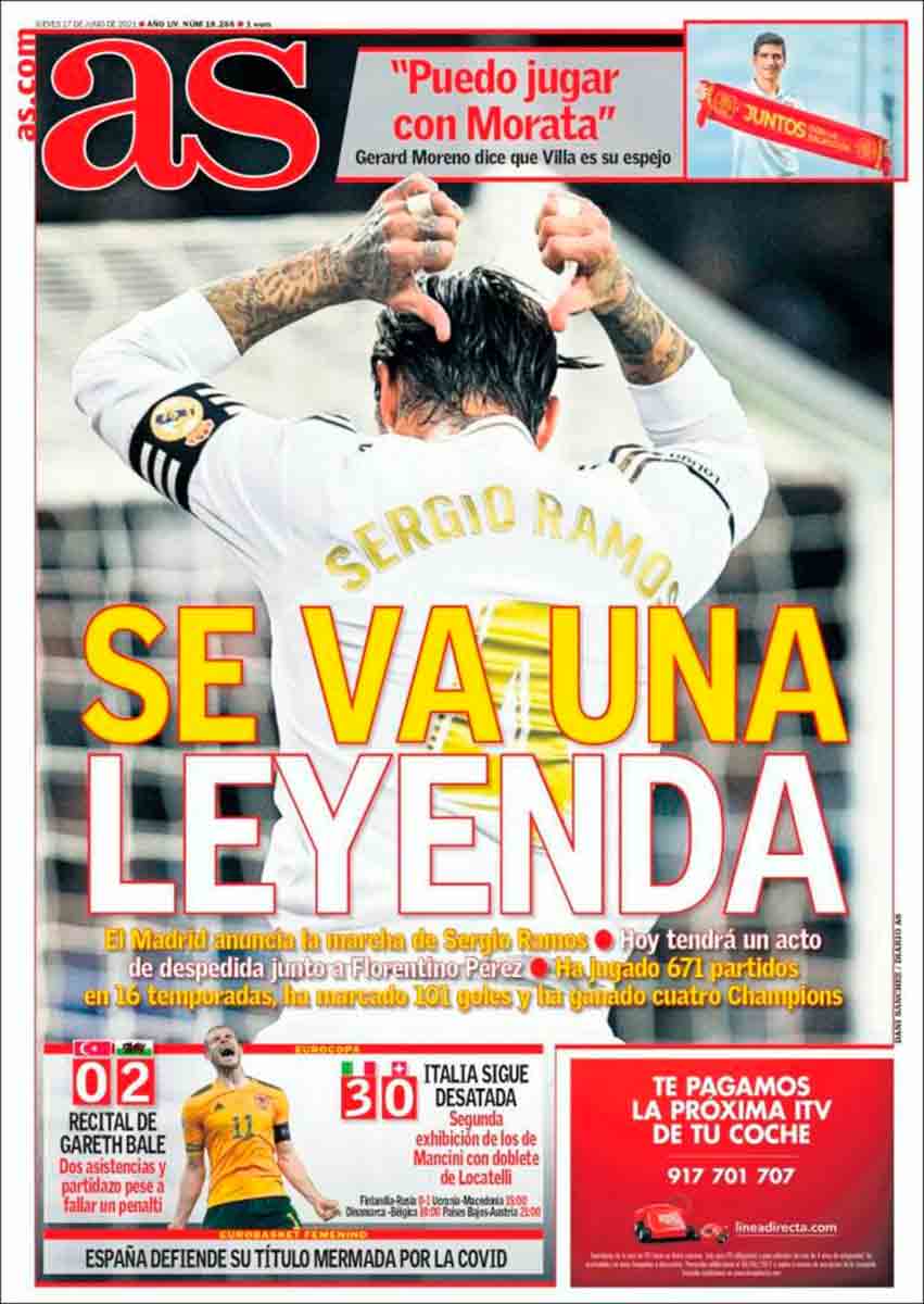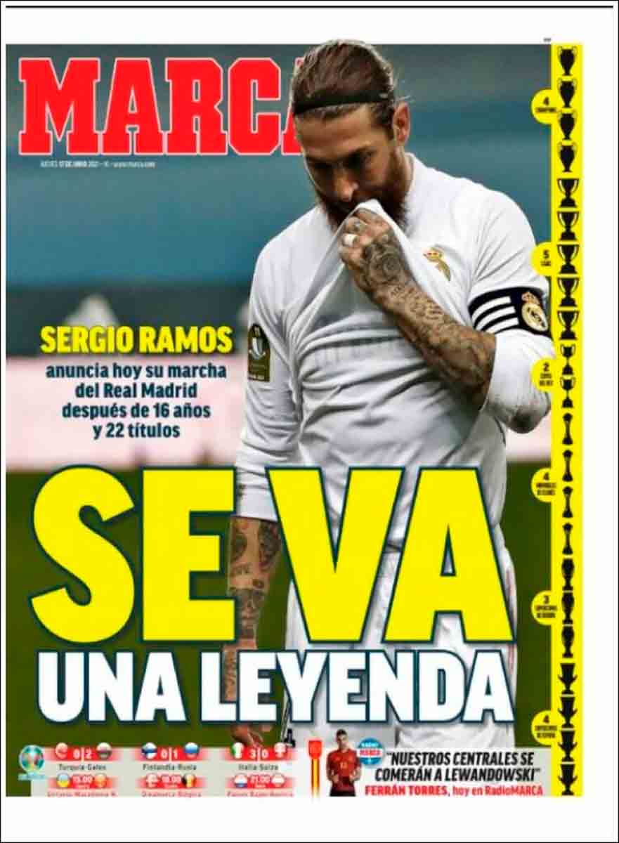 7. Marca y As cada vez se parecen más, ya hasta se copian los titulares. Adiós a Sergio Ramos, un jugador que está entre los 15 más grandes en la historia del Madrid. No han alcanzado un acuerdo de renovación las dos partes y se acabó el asunto, no sé donde está la polémica que algunos queréis buscar. Uno como yo diría que por las noches Ramos se dedica a tocar vuestros timbres y despertaros en medio de un gran sueño. Muchos sois tan ridículos como lo es la prensa a la que tanto criticáis y con razón.