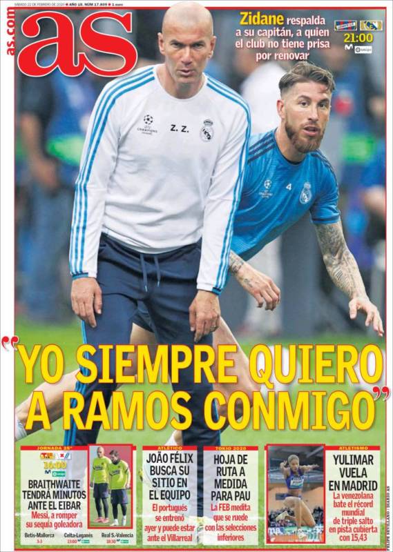Buenos días. Enredando, que es gerundio. A pregunta de algún redactor en la rueda de prensa prepartido de ayer, Zinedine Zidane dijo que siempre quiere tener a Ramos consigo. La frase sería una simple declaración de admiración y gratitud considerada aisladamente. Puesta en el contexto de la campaña mediática para que el Real Madrid acceda a los términos de renovación de contrato pretendidos por Sergio Ramos, la frase es usada aquí como un instrumento de presión más. Sergio Ramos es una leyenda del Real Madrid, uno de los protagonistas esenciales en el segundo máximo ciclo de éxitos de la Historia del club. Es un pilar básico en el pasado reciente de la entidad, su presente y su futuro. También es un hombre favorecido por un entorno hiperactivo en la búsqueda de la ayuda  de la prensa para el logro de sus (siempre legítimos) objetivos. Esta portada es buena muestra de ello. "Zidane respalda a Ramos, a quien el club no tiene prisa por renovar" es la muy manipuladora lectura que hace As de las palabras del entrenador.