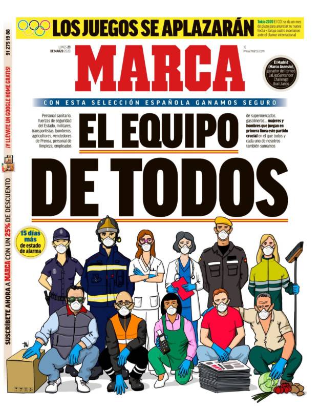 En medio de todo esto, brilla con luz propia la primera plana de Marca, a cuyo espíritu nos unimos con todo el corazón, como no podía ser de otro modo. Nos unimos a ese cerrado aplauso a todas las personas que nos proveen de servicios de primera necesidad en estos tiempos imposibles, en especial al personal sanitario, héroes de este momento extraordinariamente dramático que vive nuestra sociedad.