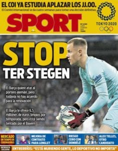 En Sportlandia, mientras tanto, siguen con sus cosas, y quién sabe, a lo mejor hacen hasta bien. Produce rubor, eso sí, que tomen a sus lectores por tontos (entendemos que no lo son -?-) hablando de fichajes y renovaciones millonarias cuando su club, el Barça, ha semianunciado en los medios afines (incluso, oh maravilla, el propio Sport) la posibilidad de tener que hacer un ERTE para poder sobrevivir no solo a la crisis del coronavirus (aunque ellos pretendan hacer ver que es solo eso) sino al hecho mismo de que ya estaban más tiesos que la mojama antes de que el Coronavirus se personara sin que nadie le hubiera llamado. El que el portero Ter Stegen tenga la renovación parada no es por deformación profesional (si así lo fuera, atacantes como Messi la tendrían muy adelantada y no es el caso), sino que constituye síntoma inequívoco del temor de sus futbolistas a que la situación financiera que atraviesa el Barça le impida un día honrar sus contratos, como de hecho ya está sucediendo.