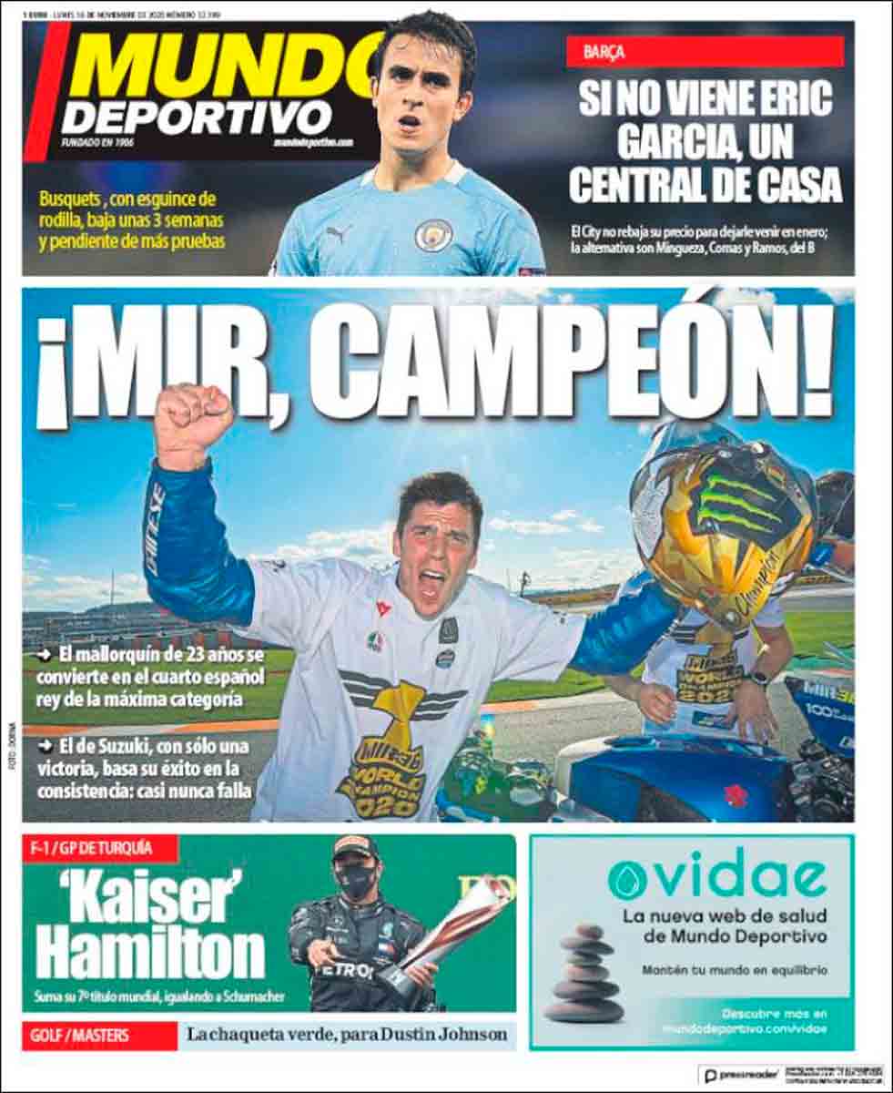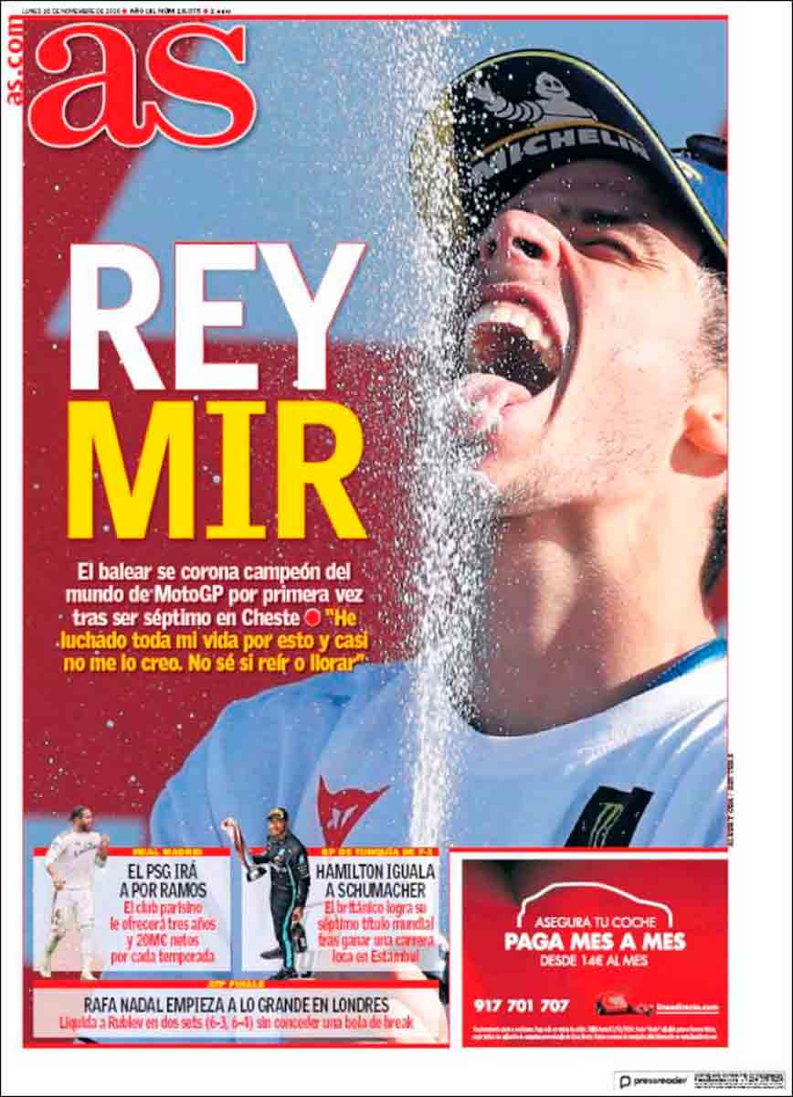 “Rey Mir”, proclama con toda justicia As en referencia al piloto mallorquín, junto a una foto en que la que Mir nos recuerda a Gareth Bale. Se diría que As es incapaz de superar las viejas obsesiones. Esa expresión de júbilo a lengua sacada es, si hacemos excepción del champán fluyendo a borbotones, muy característica del ya casi exmadridista cuando metía goles que valían Champions blancas, aunque no era esa la razón por la que As le daba portadas. Muchos galeses tienen casas en Mallorca, por ahí tal vez venga la conexión. Decíamos antes de Ramos y el camero también aparece en la portada de As, donde se menciona su posible partida al PSG.