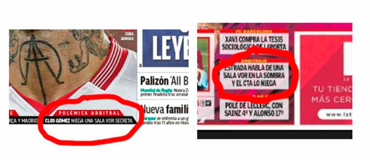 Pero lo que queríamos destacar en las portadas dizque madridistas es el enorme espacio que le dedican al escándalo que se supo ayer respecto al uso de una sala oscura y alternativa para el control del VAR. Ah, ¿que ustedes tampoco lo han visto? Fíjense bien, figura en un espacio enorme, gigantesco, a los ojos de todo el abochornado aficionado del fútbol patrio. ¿Siguen sin verlo? Pues les ayudamos con la lupa.