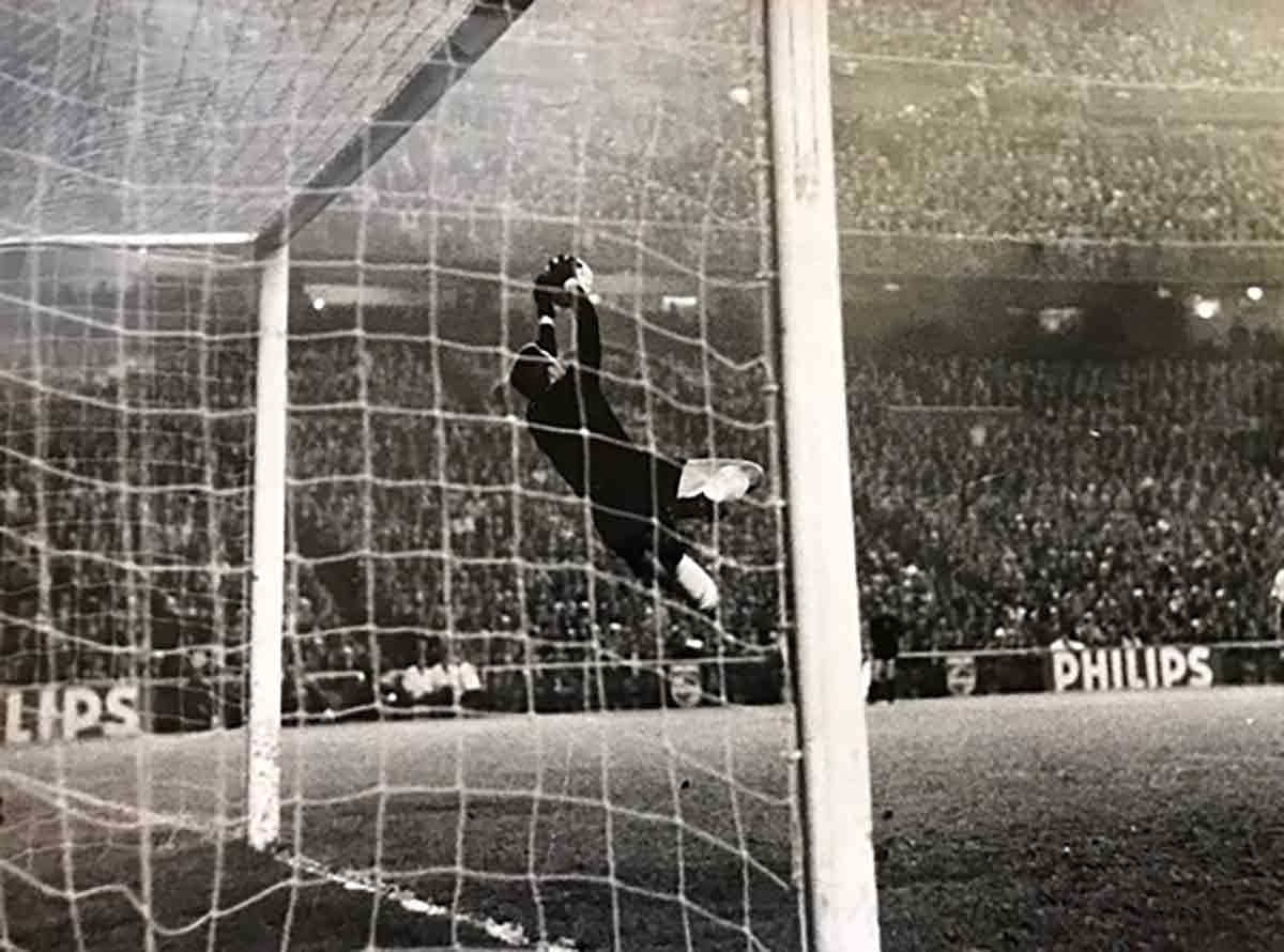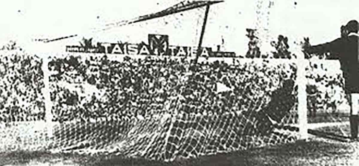 Pero lo más grande de este penalti que el grancanario Betancort 'negó' a Rogelio es el testimonio gráfico para la posteridad —he ahí la fotografía que se ha podido rescatar— de que el árbitro internacional Ortiz de Mendívil (segundo apellido que los cronistas vascos y vizcaínos escriben con 'v') 'controlaba' el lanzamiento de los máximos castigos apoyado en el poste de los porteros. Ahí está. En el poste derecho de Betancort. Insólito.