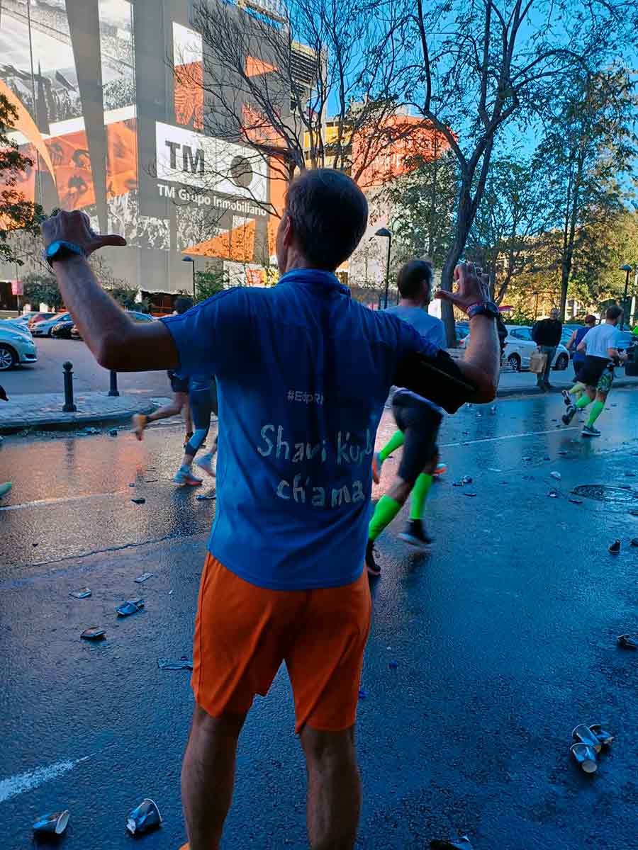 Parece que le gustó porque repitió la frase “¡Shavi k’udis ch’ama en meta, campeón!”, exacto, tú lo has dicho, amigo, ¡suerte! El ambiente en las carreras suele ser una maravilla: buen rollo, ganas de apoyar a los sufridores del asfalto, casi todo son ánimos y gestos de apoyo y complicidad. Lo normal, lo que debería ocurrir también en las gradas de los estadios. Por cierto, chiste valenciano que me contó Juanra, otro amigo de la zona, sobre el estadio inconcluso del Nou Mestalla: “Tenemos el medio campo más caro del mundo”.