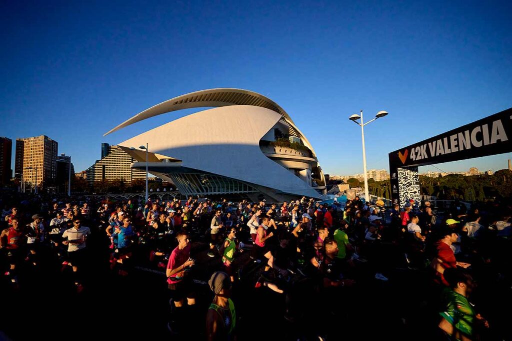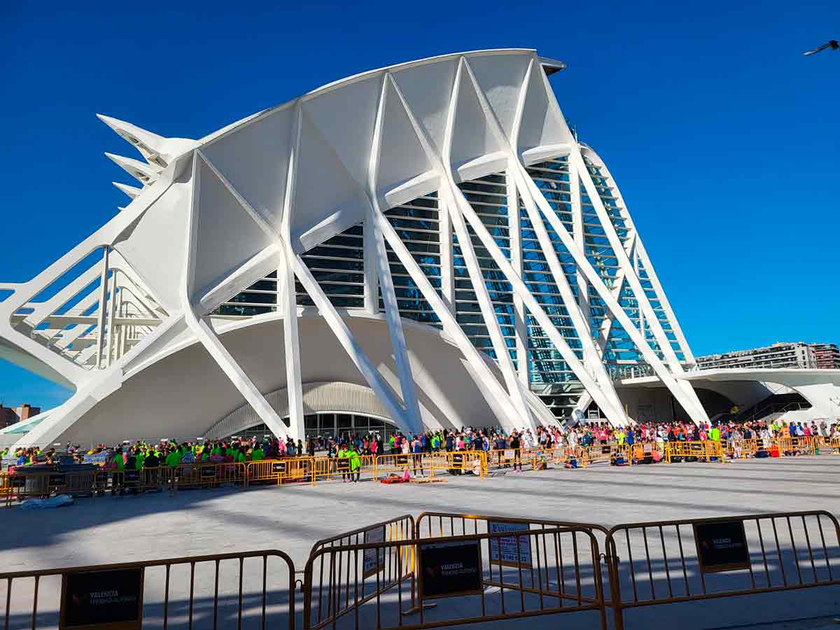 Entre unas cosas y otras, y ayudado por los ánimos de tanta buena gente allí congregada, logré llegar a meta en tres horas y cincuenta y tres minutos. La entrada era magnífica, muy bonita, junto a los edificios diseñados por Calatrava “a la manera de Calatrava”. Los aplausos de la multitud congregada en el puente y en los aledaños de la carrera nos ayudaron a hacer algo parecido a un sprint final, un tanto penoso, con una zancada tan corta como las de Andújar Oliver en sus peores tiempos (¿acaso algunos no lo fueron?).