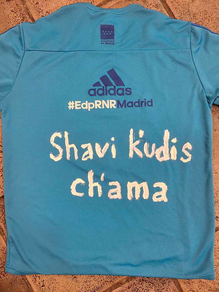 Finalmente elegí una de tantas camisetas de corredor, una cualquiera. Pero a lo que no pude sustraerme fue a imprimir en mi espalda el hermoso mensaje que un amigo galernauta pronunció en cierta noche reciente en la que el Madrid goleaba 5-1 al Valencia: “Shavi k’udis ch’ama”. Un poco de pintura blanca, algo cutre, pero ahí quedó para pasear por las calles de Valencia.