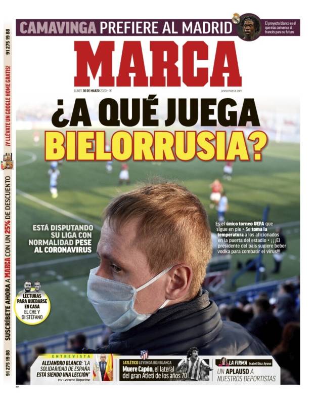 Seguro que no sabíais (Wikipedia sí) que Bielorrusia es uno de los países más planos del mundo, siempre por debajo de los 300 metros sobre el nivel del mar. Entre Wikipedia y Marca, ya sabemos de la armonía que existe por allí entre la orografía y el cerebro de su máximo mandatario. Bielorrusia tiene tres partes geográficas bien diferenciadas: la del norte, poblada de lagos (en la orografía del portanálisis sería Marca), la meseta boscosa central (la Meseta, recalcitrante y pipera, sólo puede ser As) y la pantanosa zona sur, llamada Marismas de Pinsk. Las marismas de Pisnk, que tienen una pintaza como primer destino turístico una vez toque a su fin el confinamiento, sólo pueden encontrar en Sport su paralelismo, sin que se precisen muchas más explicaciones.