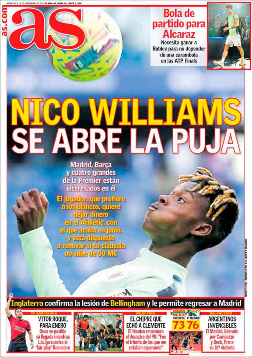 As habla de la situación contractual de Iñaki Williams, buen jugador que acaba contrato con el Athletic Club y podría renovar o no. Dice As que al futbolista le tira el blanco sector Concha Espina, lo cual no sorprende. En espacios inferiores, se nos comunica la victoria del Madrid a orillas del Turia (días negros para el valencianismo sociológico) y de que la liga va a suavizar el “fair play” para que el Barça puede traer a Vítor Roque. Para nosotros que se han equivocado con las comillas y las querían poner no solo en “fair play” sino también en “suavizar”.