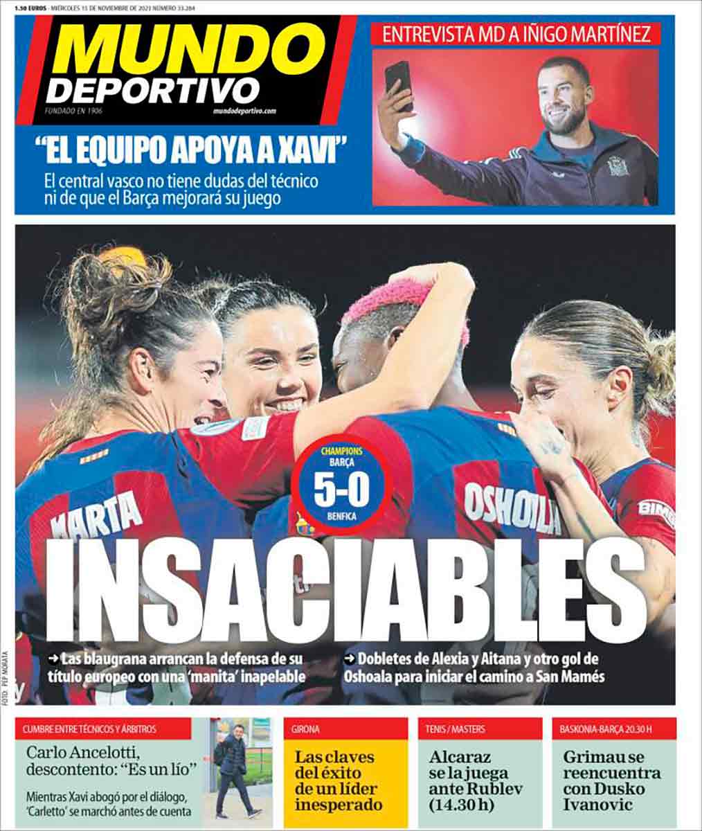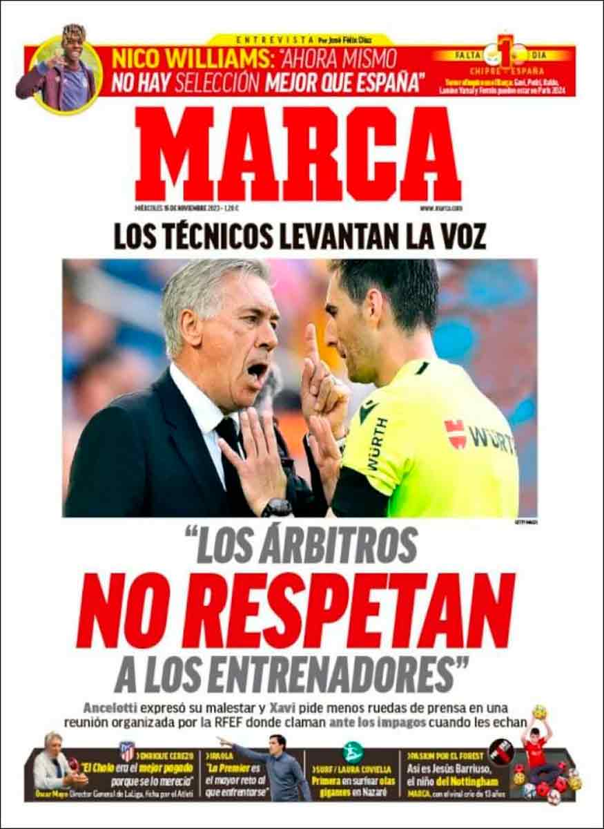 Y atención, en recuadro inferior, al tratamiento que Mundo Deportivo hace de la antedicha reunión de los técnicos en la sede de la Federación. Según el ilustre rotativo barcelonés, Ancelotti se marchó “antes de cuenta”, expresión que nos fascina, tanto en su significante como por el hecho de que Carlo no haya preguntado a Mundo Deportivo, antes de la reunión, hasta qué hora tenía que quedarse. Xavi, en cambio, “abogó por el diálogo”. Qué bien se dialoga previo unte de tu jefe al interlocutor.