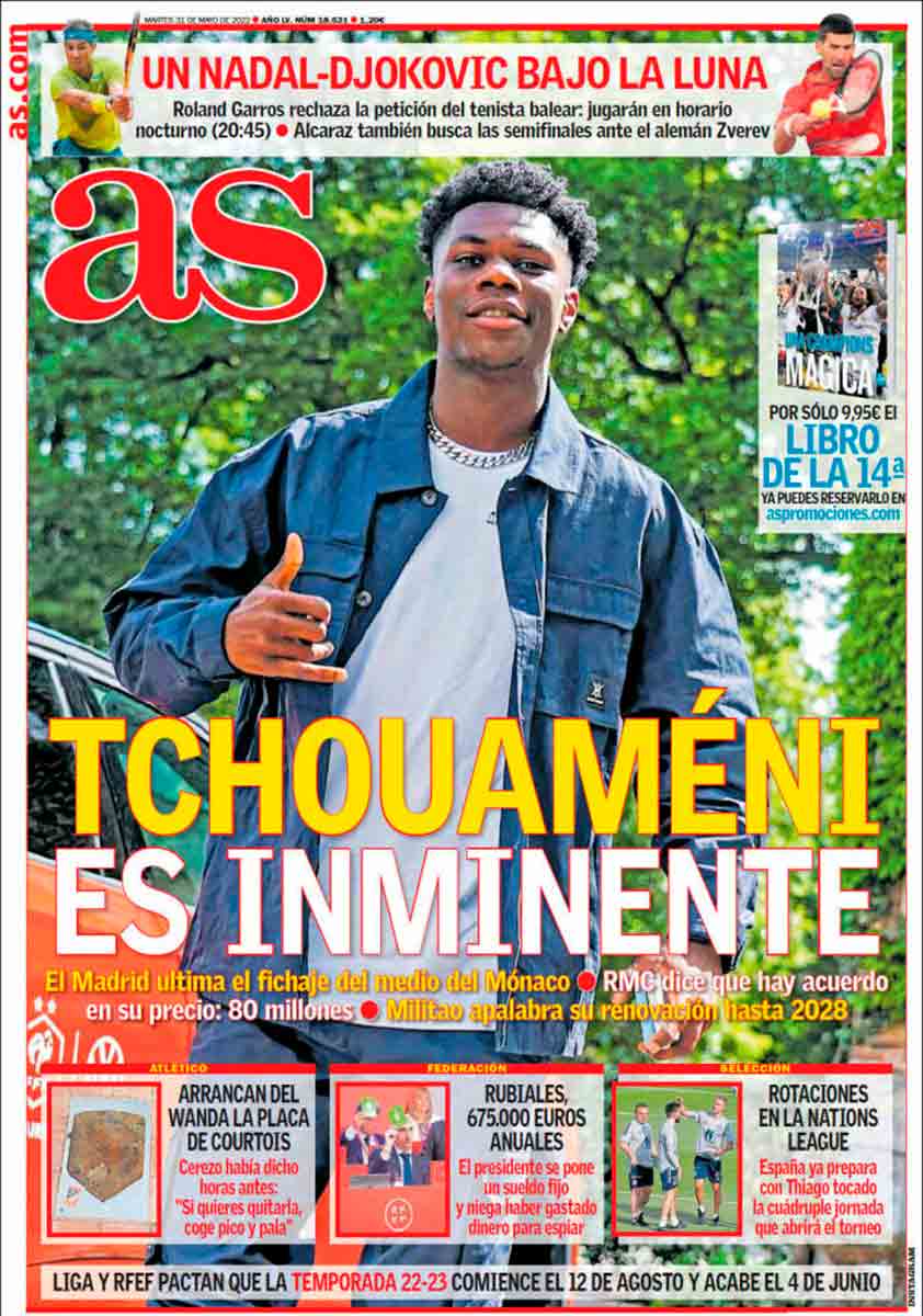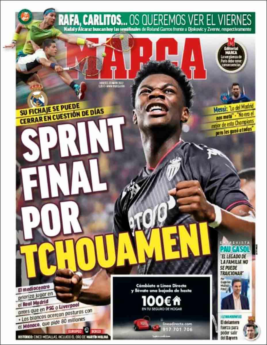 Marca viene sin los tres jugosos recuadritos de AS, pero su noticia principal es la misma, Tchouaméni, ese futbolista que cuando escuchas su nombre pronunciado por un francés parece que está votando en Eurovisión.