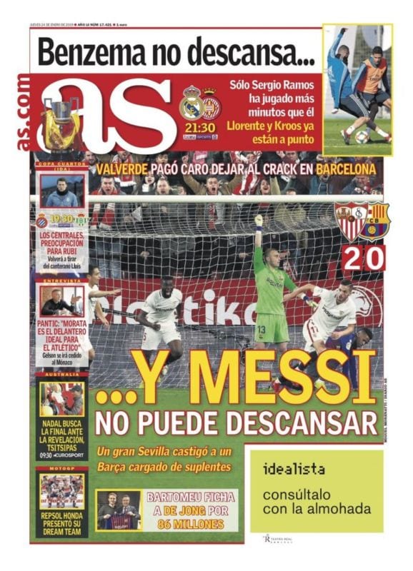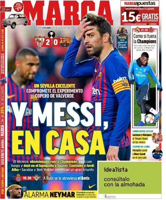 En Madrid sí destacan la derrota del Barcelona. Aunque, más que el varapalo sufrido, lo que muestran, o al menos intentan, es que sin Messi no hay paraíso. Ya se sabía. Pero, claro, cuando vendes, incluso desde la capital, que el Barça es un rodillo, un equipo de juego fantástico y funcionamiento perfecto, acabas reculando. El excelso equipo blaugrana se reduce a la inspiración del argentino y, en ocasiones, muchas, a las intervenciones de Ter Stegen. Sin embargo, la prensa madrileña no se ha dado cuenta hasta enero de 2019.