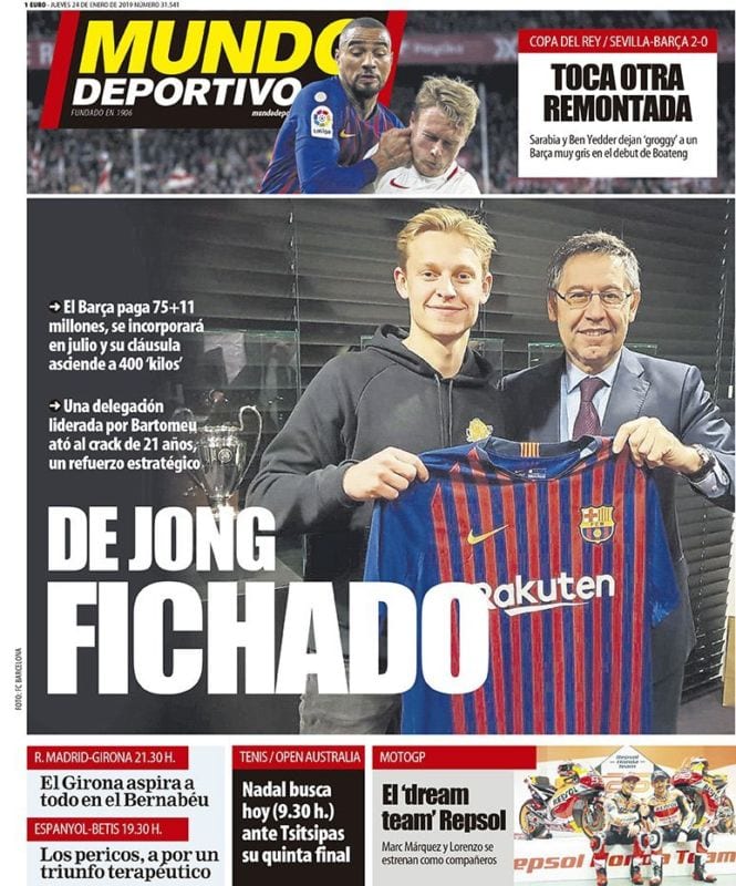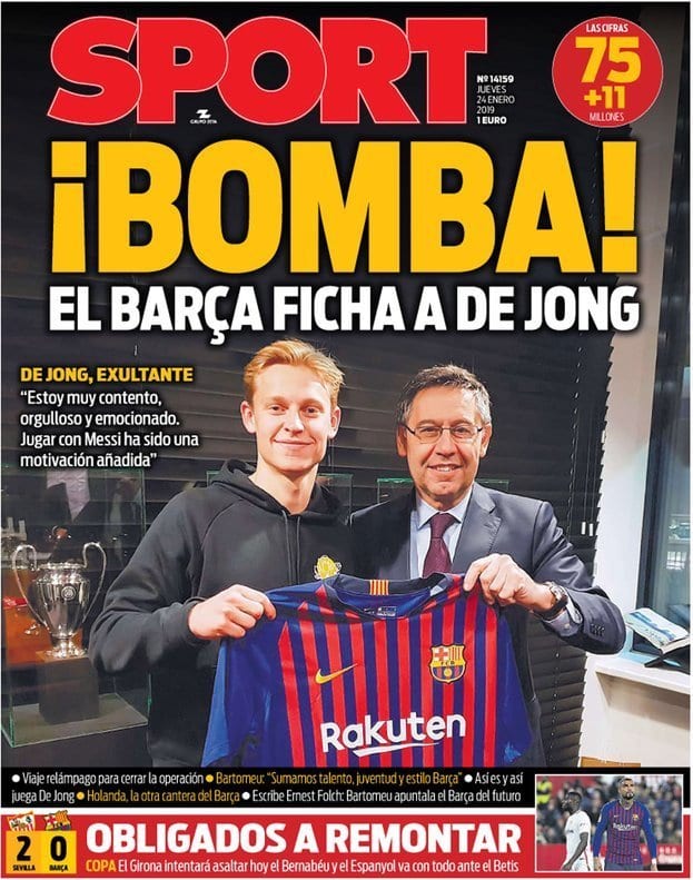 La historia es que la derrota obliga al Barcelona a remontar si no quiere reducir a dos las competiciones por las que luchar esta temporada. Pero lo importante es De Jong. Importa más hablar de un jugador que llega en junio que del tropiezo de un conjunto que sin Messi y el VAR baja muchos enteros. Parafraseando la famosa portada de Sport sobre Modric podríamos decir: "75 millones para tapar un 2-0".