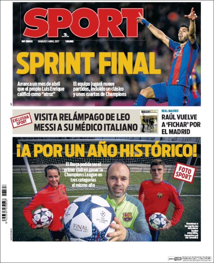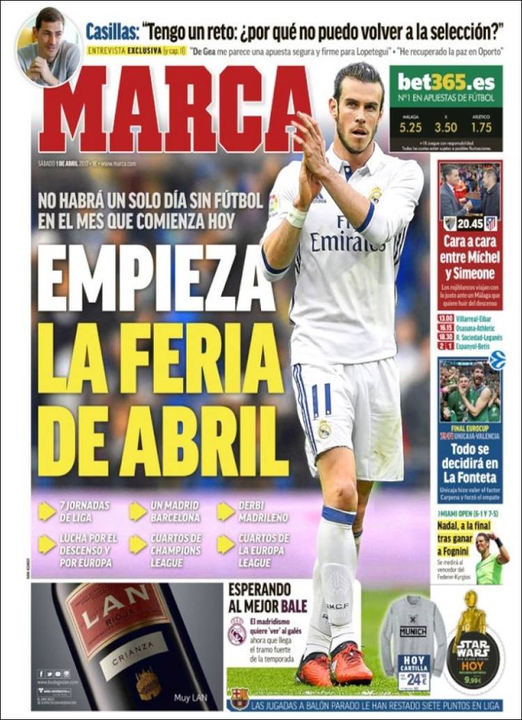 Solo Marca y en menor medida Sport parecen haber recuperado un poco el vigor tras el parón. Ambas portadas se hacen eco de lo que está por venir ya mismo, desde mañana mismo, en un mes de abril que hoy empieza y que acabará también casi ya mismo -así de soplo es la vida- con bastantes cosas decididas. Como bien informa Marca, tendremos en este mes siete jornadas de Liga, un Madrid-Barcelona, un Madrid-Atlético y dos Madrid-Bayern. Casi nada, queridos galernautas. Casi todo.