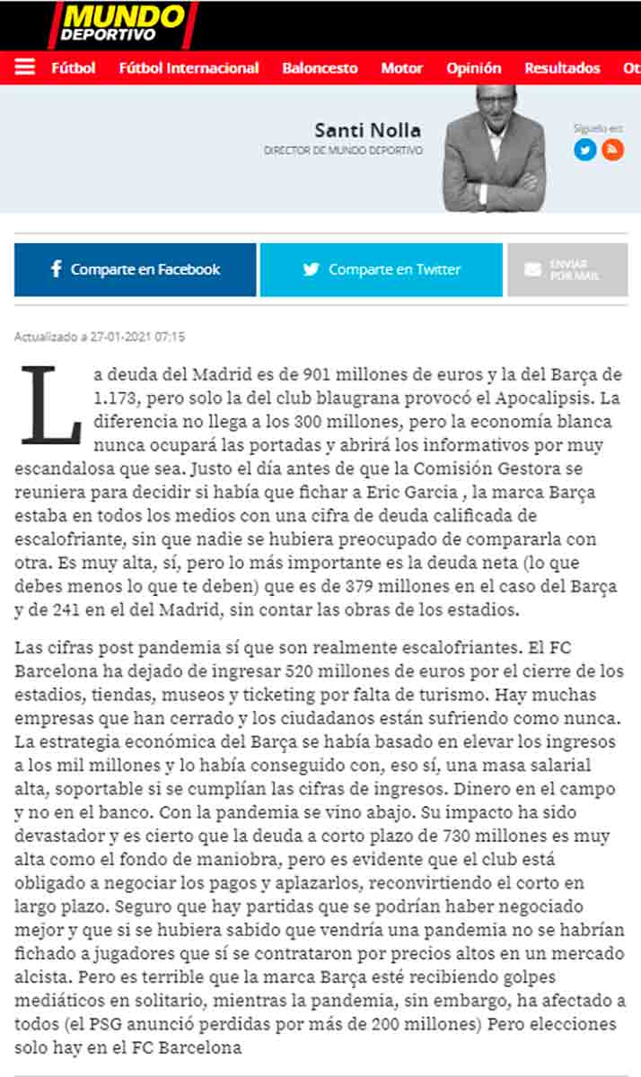 “La deuda del Madrid es de 901 millones de euros y la del Barça de 1.173, pero solo la del club blaugrana provocó el Apocalipsis. La diferencia no llega a los 300 millones, pero la economía blanca nunca ocupará las portadas y abrirá los informativos por muy escandalosa que sea (…). Es terrible que la marca Barça esté recibiendo golpes mediáticos en solitario, mientras la pandemia, sin embargo, ha afectado a todos (el PSG anunció perdidas por más de 200 millones) Pero elecciones solo hay en el FC Barcelona”.