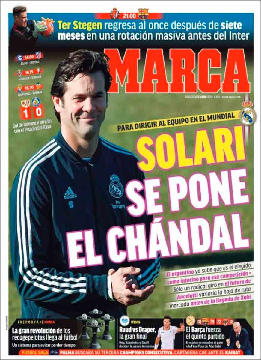 Solari se pone el chándal, pero la liga no ha terminado, luego haríamos bien en pensar en el partido de mañana frente al Celta, como nos recuerda la portada del diario As: