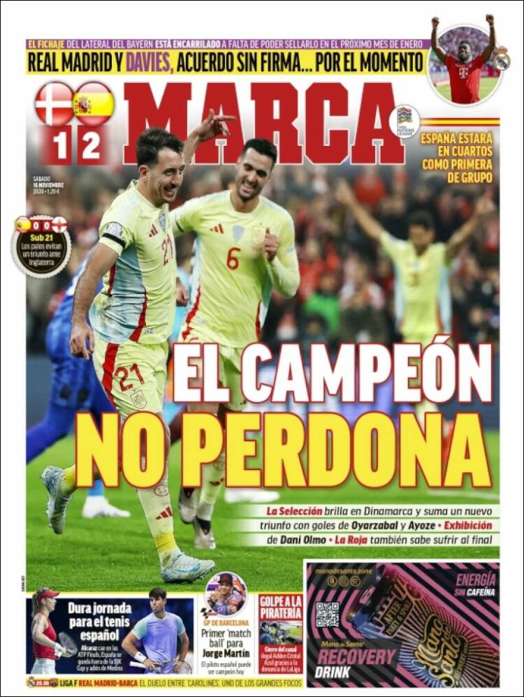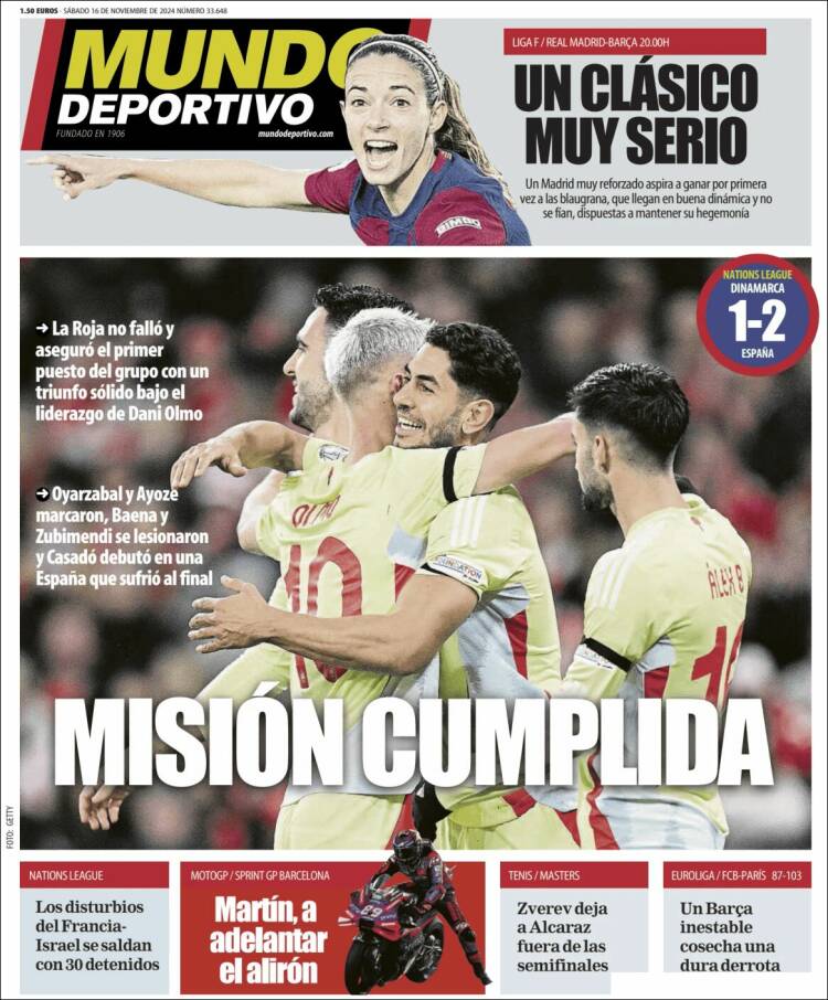 Mundo Deportivo continúa con el monoargumento del partido de La Roja (la siguen llamando así, para incrementar el alipori), pero añade a su frontispicio una referencia al encuentro de la Liga F entre el Real Madrid femenino y el Barça, que se disputa esta noche. El periódico de Godó, grande de España, admite que las entrenadas por Toril llegan “muy reforzadas” y “aspiran a ganar”. Sería un hito para la sección el conseguir derrotar, por fin, al equipo más fuerte del mundo. Las blancas llegan pletóricas después de derrotar 7-0 al Twente, y con la sensación de que esta vez se ha dado con la tecla en los fichajes. Leopolz y Weir conforman una medular extraordinaria junto con peones de brega como Tolleti o Teresa, y llegan en gran forma delanteras como Linda Caicedo o Naomi Feller.