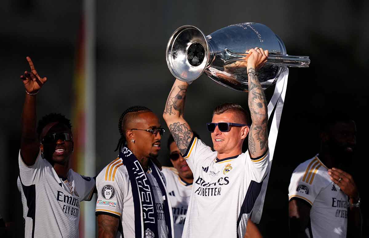 Los héroes fueron desfilando, glosados uno a uno por el speaker, en loor de multitudes. Saltaban al campo, saludaban y ascendían hasta lo alto del cubo gigante en cuyos lados se habían proyectado vídeos de todas las Copas de Europa anteriores. Todo animado nuevamente por el riff inextinguible de Seven Nations Army, o sea, de Somos los Reyes de Europa. Aclamadísimos Courtois, Lunin (sí, los dos), Vini —para quien volvió a pedirse el Balón de Oro—, Mendy, Rüdiger, Modric, Joselu y por supuesto Kroos. Hay que cantar "Toni, quédate" aunque no haya posibilidad alguna de marcha atrás. Quién sabe si cantándolo hoy no estaremos obrando el efecto retroactivo de que no se fuese el año pasado, donde recordemos que ya hizo amago. Hay ejemplaridades implacables.